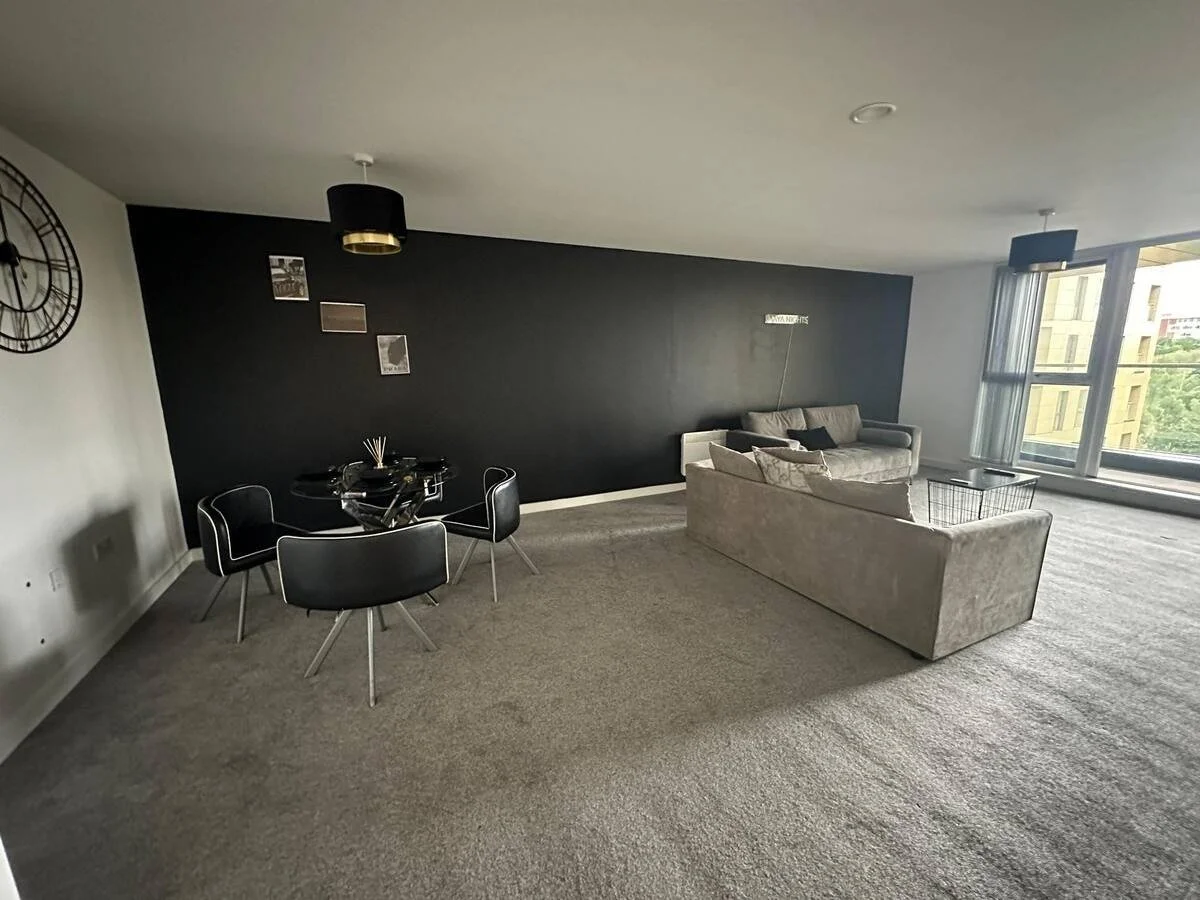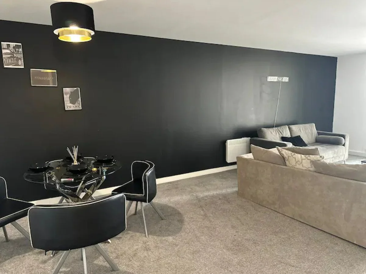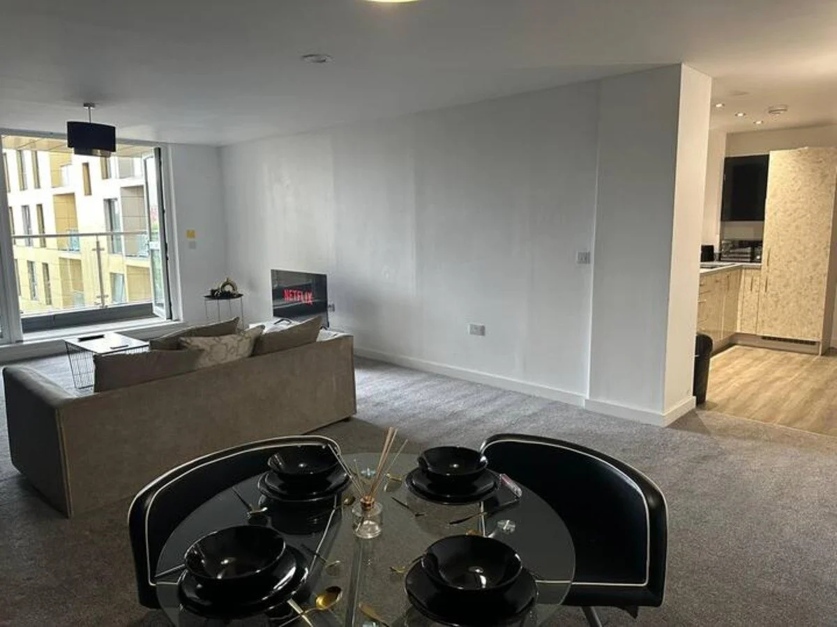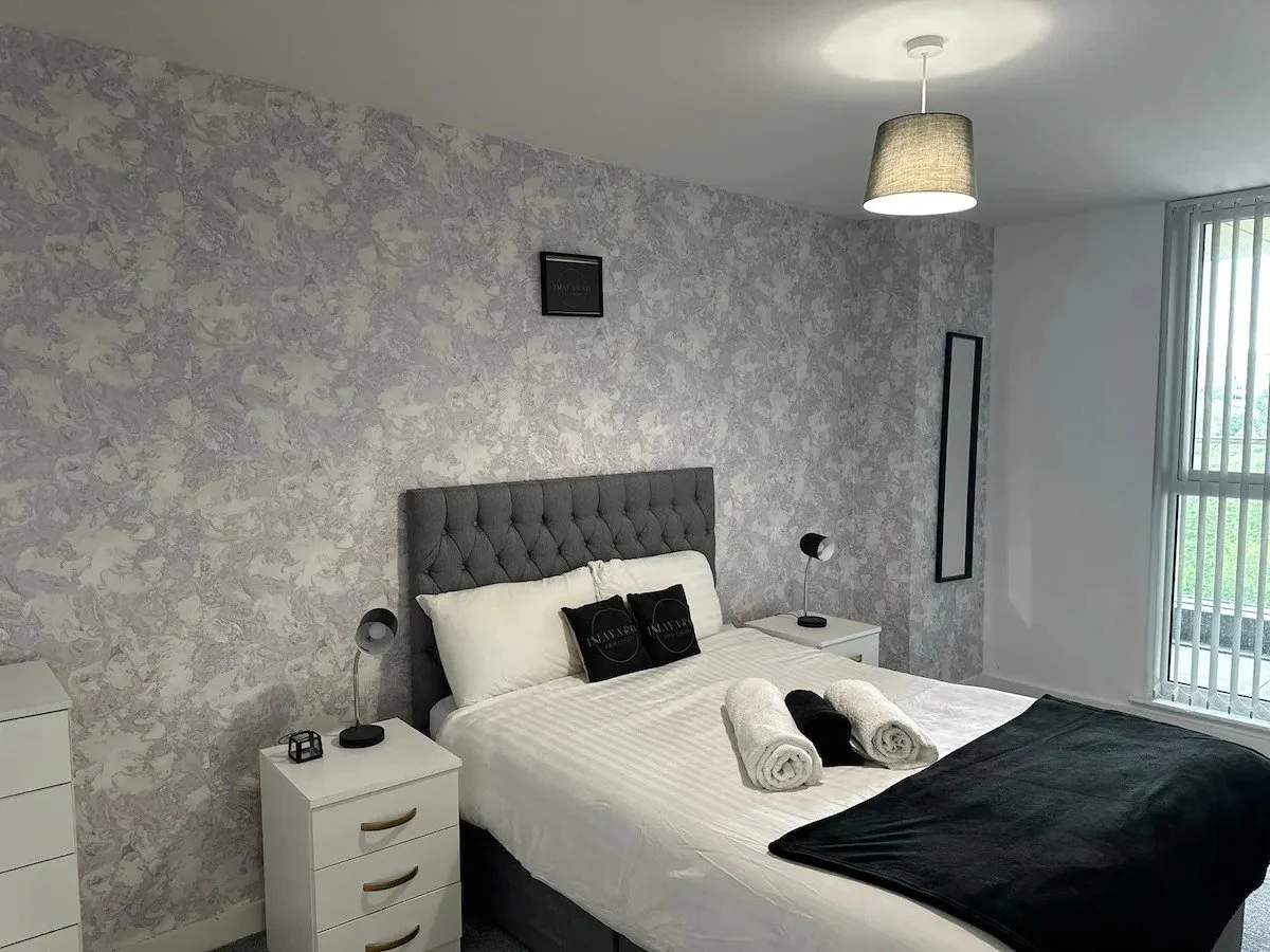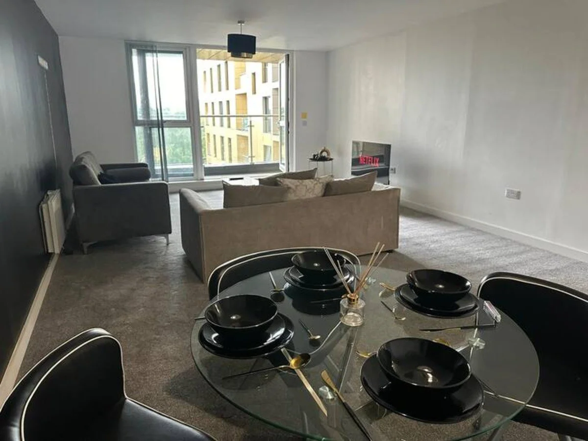Modern 2-bedroom apartment with stunning river views, hosted by Downtown Luxury Stays in partnership with Staycasa Accommodation. Located near Salford Central Station, this stylish apartment accommodates up to 4 guests and offers excellent transport links, making it ideal for both business and leisure stays.